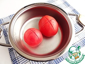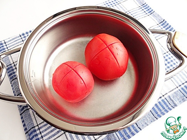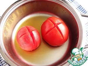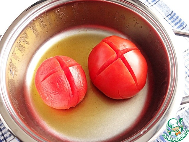 Снимаю сотейник с плиты. Помидоры становятся мягкими. Снимаю с них кожицу.