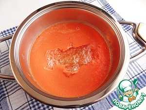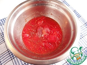 С помощью блендера измельчаю помидоры, добавляю отжатый листовой желатин. Перемешиваю массу до растворения желатина, даю ей остыть.