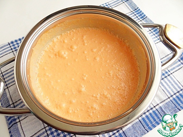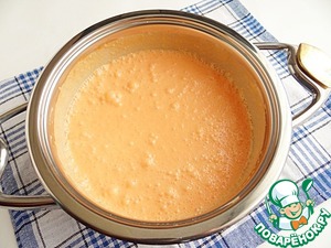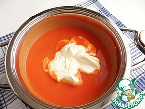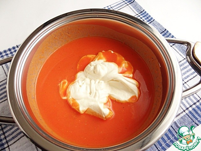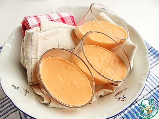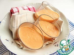 Стаканы помещаю в миску с полотенцем, так, чтобы они находились в наклонном положении. Заливаю томатно-сливочную массу в стаканы и убираю в холодильник до застывания.