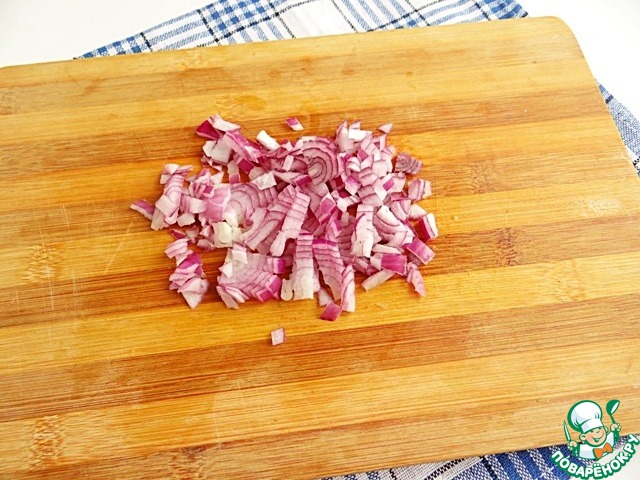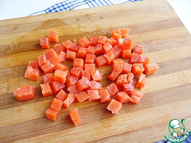 В это время готовлю салат. Нарезаю филе форели небольшими кубиками.
