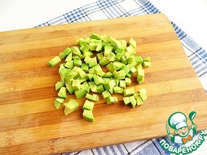Авокадо очищаю, удаляю косточку и нарезаю тоже небольшими кубиками.