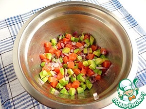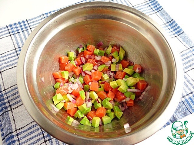 Соединяю в миске нарезанное филе форели, авокадо и красный лук. Добавляю оливковое масло, лимонный сок и солю по вкусу.