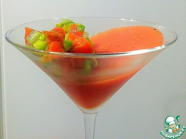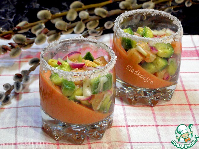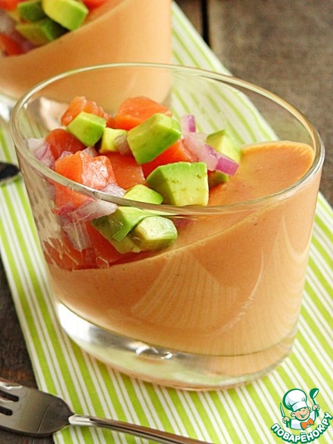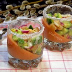 Непосредственно перед подачей в стаканы с застывшей томатной массой добавляю рыбный салат. Закуска готова! Приятного Вам аппетита!