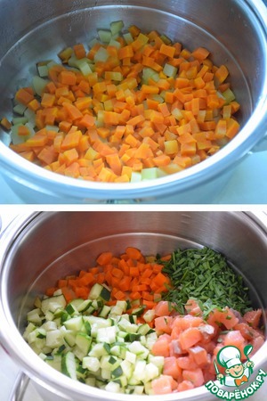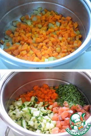В кастрюлю выкладываем морковь и картофель (готовим по Zepter-правилам: варим овощи без воды и соли).