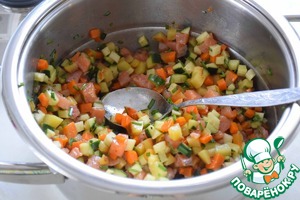 Закрываем кастрюлю крышкой, ставим на средний огонь и нагреваем (следим за стрелкой термоконтроллера (шкала внешняя): как только стрелка дойдет до начала зеленого сектора, переставляем кастрюлю на самый маленький огонь (самую маленькую конфорку) и готовим до того момента, когда стрелка термоконтроллера дойдет до середины зеленого сектора (у меня на это ушло 2-3 мин). Огонь отключаем и оставляем овощи "доходить" минут на 5. Крышку не открываем!