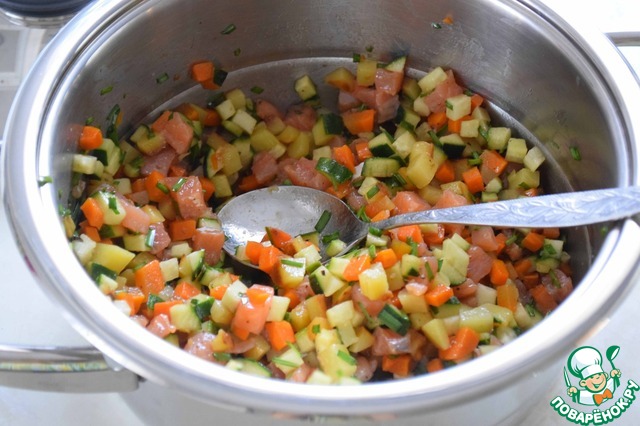 В остывшие отварные овощи добавляем порезанные огурец, семгу и джусай (или зеленый лук)