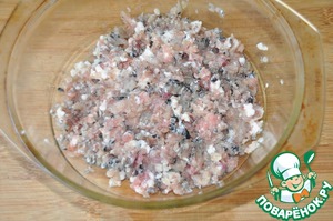 Для приготовления можете брать любую рыбу по вашему желанию и возможностям. У меня кета, которую сами поймали. Рыбу чистим, разделываем на филе (я кожу оставляю), перекручиваем рыбу с луком, чесноком и салом.