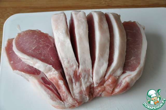 • Для приготовления идеально брать вырезку на кости с тонкой полоской сала. Мясо моем, обсушиваем бумажным полотенцем и режем острым ножом на стейки толщиной около 1,5 см, доходя до кости.