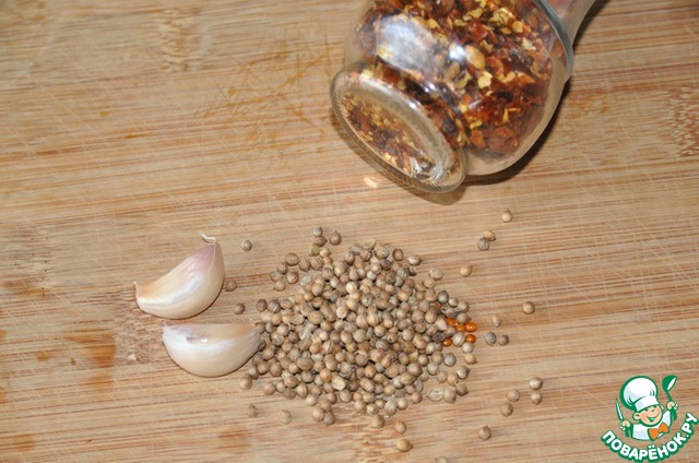• Мясо лучше замариновать заранее (1-2 часа). Для маринования берём чеснок, перец чили хлопьями и кориандр в зёрнах.