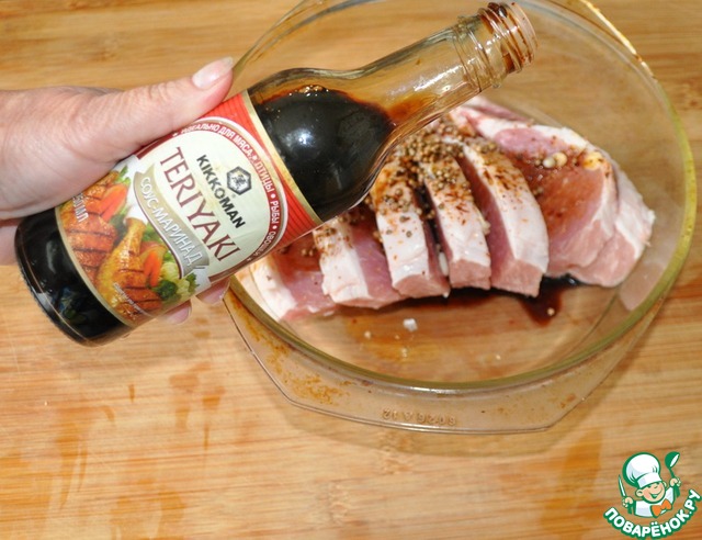 • Чеснок измельчаем, натираем им мясо, особенно внутри. Также натираем мясо перцем и кориандром. Поливаем соусом-маринадом Teriyaki от "Киккоман".