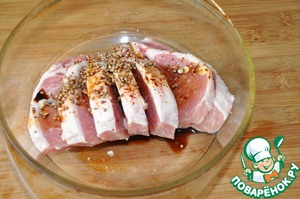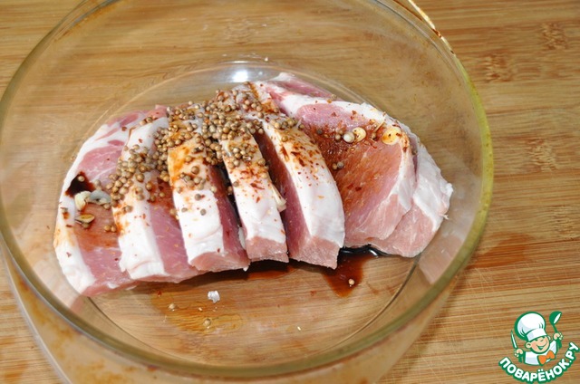 • Хорошо натираем мясо всеми компонентами маринада и оставляем мариноваться.