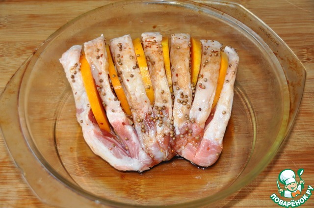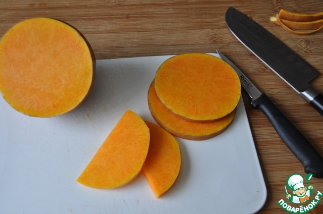 • Тыкву моем, режем полукольцами, чистим. Размеры сегментов тыквы должны быть соизмеримы с разрезами в свинине.