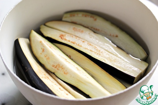 Баклажан вымыть, отрезать кончики, затем разрезать вдоль на 4 части.