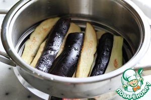 Вынуть готовый баклажан из пароварки и нарезать на небольшие кусочки.