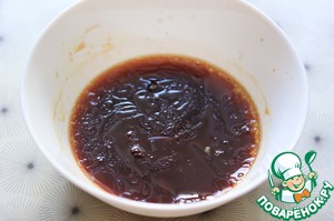 Пока баклажаны готовятся, сделать соус: смешать в миске соевый соус, гренадин, гранатовый сок, масло грецкого ореха и измельченный чеснок.