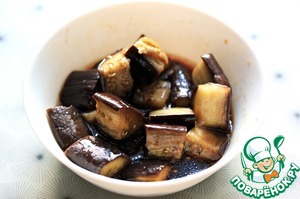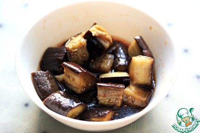 Выложить кусочки баклажана в соус и аккуратно перемешать. Накрыть миску пленкой и убрать в холодильник минимум на 30-60 минут, а лучше на ночь. Во время охлаждения желательно несколько раз перемешать.