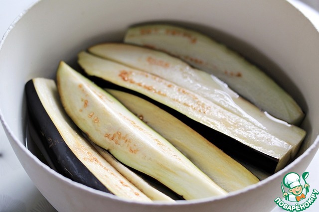 Готовые баклажаны нарезать на небольшие кусочки.