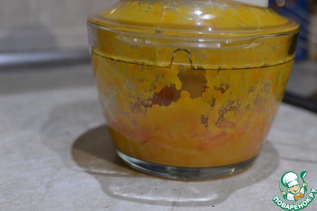 • Превращаем в пюре морковно-тыквенную смесь. прогреваем, при необходимости, выпариваем лишнюю жидкость. Я добавляю щепотку имбиря. Пюре должно быть сладковатым с легкой кислинкой, поэтому регулируем вкус, при необходимости, сахаром или лимонным соком.