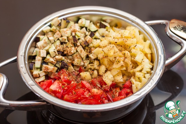 Все овощи режем мелким кубиком, лук и чеснок измельчаем, складываем в холодный сотейник (обратите внимание - без масла!), посыпаем специями (не солим!), перемешиваем...