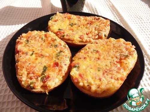 Полученную массу намазать на батон или белый хлеб. Обжарить в разогретом растительном масле, начинкой вниз при медленном огне около 10 минут. Затем перевернуть и "подрумянить" с другой стороны. Подавать горячими.