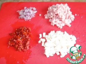 Фиолетовый репчатый лук, ветчину, вяленные томаты и моцареллу очень мелко порезать.