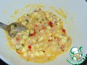 Добавить зелень, перемешать и оставить на 10-15 минут, чтобы манка набухла.