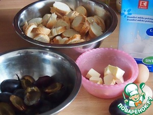 Вчерашние булки или батон тонко нарезать на кусочки размером примерно 3Х3 см, сливы помыть, удалить косточки и порезать на четвертинки.