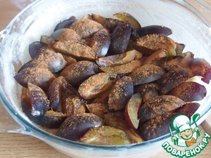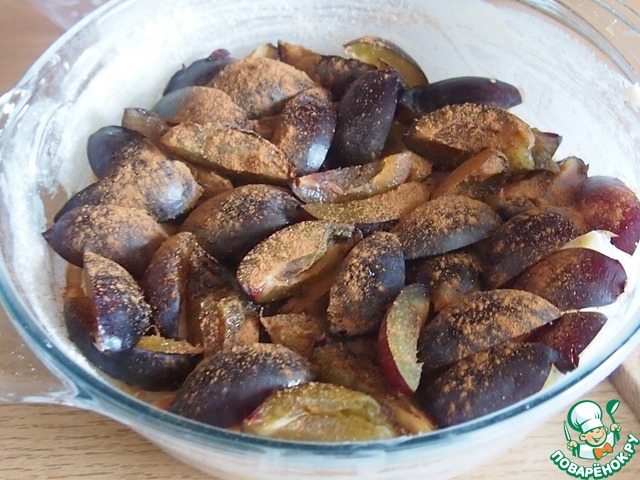 Половину хлебной массы выложить в форму, сверху разложить сливы, посыпать их корицей и толченой гвоздикой. Если сливы кисловатые, то можно посыпать сахаром (1 ст. л.).