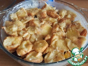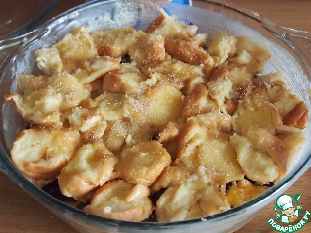 На сливы выложить остаток хлебной массы, полить растопленным маслом и посыпать сахаром.