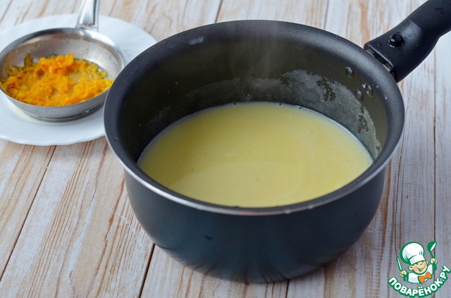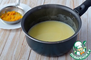 Соединить сливки, цедру и сахар, поставить на огонь, довести до кипения, проварить пару минут.
