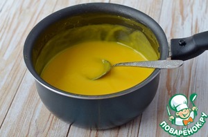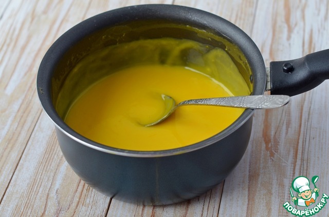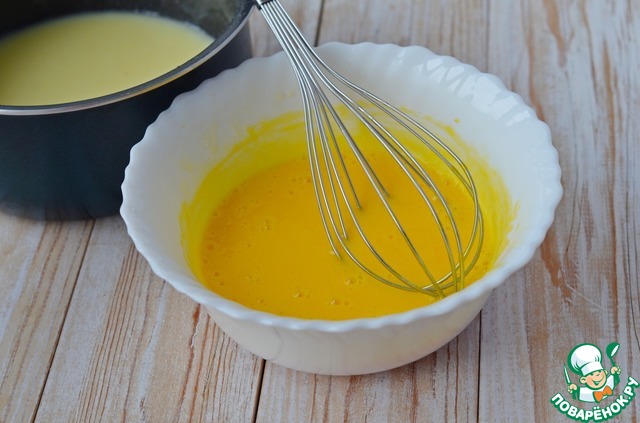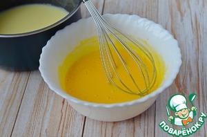 Желтки взбить, добавить в них половину сливочной смеси, размешать.