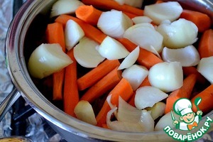 Сверху кладем очищенную морковь и лук. Наливаем в кастрюлю 1/2 ст. горячей воды - не кипятка.