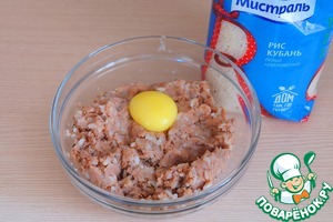 В миске соединить рыбный фарш, отварной рис, измельченный репчатый лук, яичный желток, черный молотый перец, смесь пряных трав, соль добавить по вкусу. Фарш тщательно перемешать.