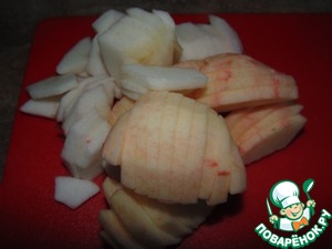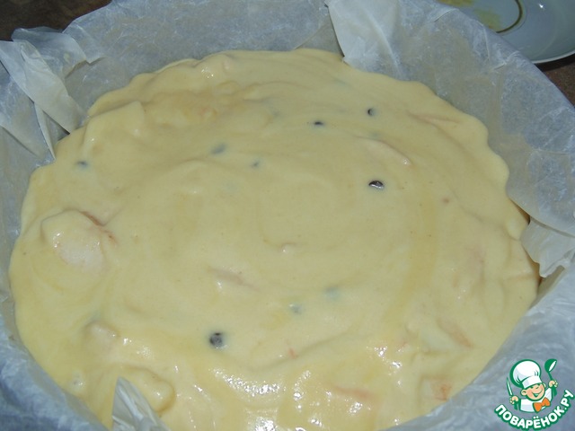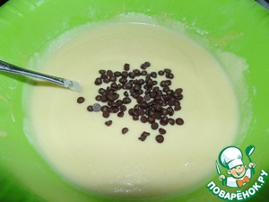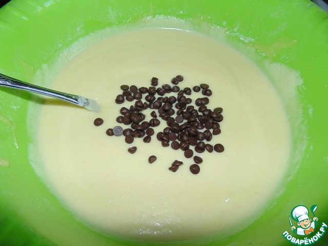 В тесто добавить шоколадные капли и яблоки. Перемешать.