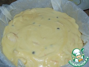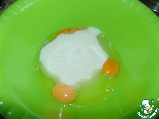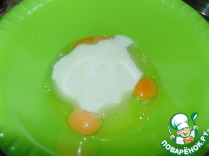Сливочное масло растопить и влить к взбитым яйцам. Добавить ванильный сахар, разрыхлитель и постепенно всыпать муку.