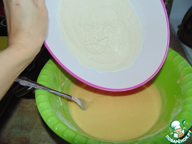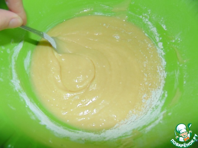 В тесто постепенно добавить манку, перемешивая ложкой (от сильного взбивания может получится слишком плотное тесто)