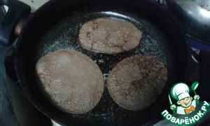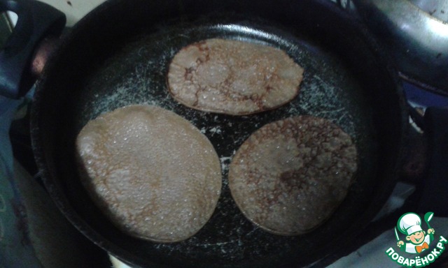 • Блинчики жарить с обеих сторон на хорошо разогретой сковороде, политой растительным маслом, до золотисто-коричневой корочки. Следить, чтобы блинчики не подгорели, потому что жарятся они достаточно быстро.