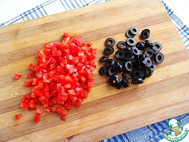 Сладкий перец нарезаю кубиками, а оливки - колечками.