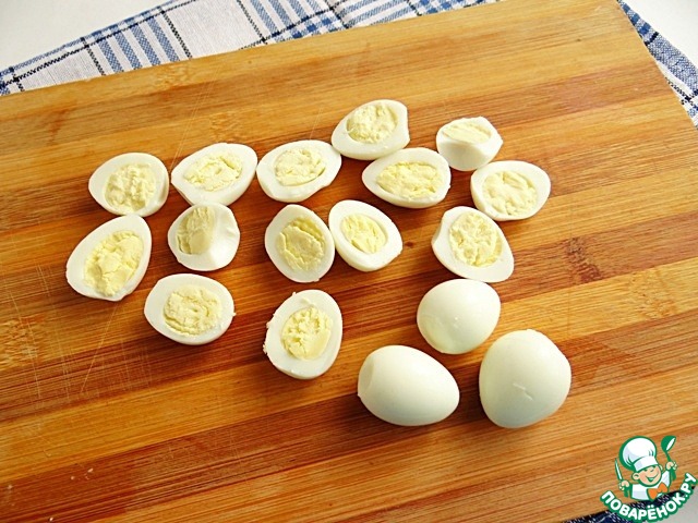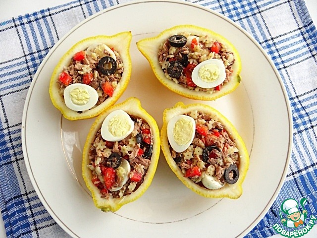 Выкладываю салат в лимонные чашки, сверху украшаю половинкой перепелиного яйца.