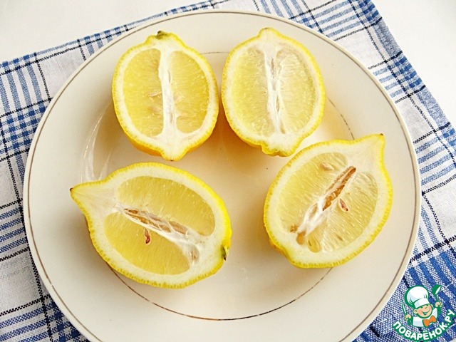 Для того, чтобы лимонные чашки были заполнены всем салатом, потребуется около трех лимонов. Лимоны мою, обсушиваю с помощью полотенца, разрезаю вдоль пополам.