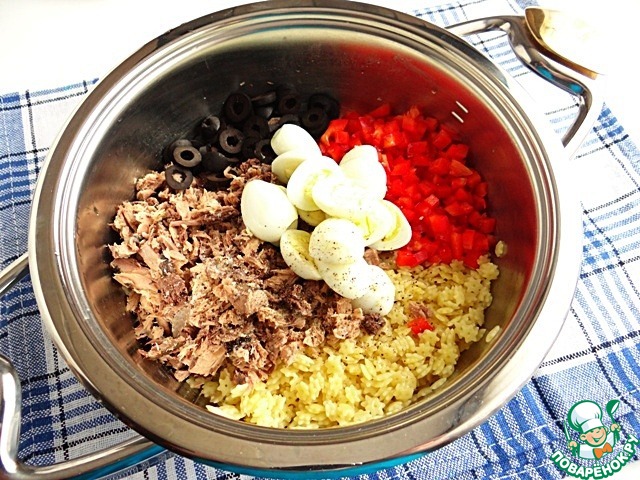 В кастрюлю к макаронам добавляю яйца (по одной половинке яйца я оставляю для украшения сверху каждой лимонной чашки), тунец, сладкий перец, оливки, оставшееся оливковое масло, соль и перец черный молотый по вкусу. Перемешиваю салат.