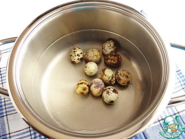 В кастрюлю выкладываю перепелиные яйца, добавляю 1 столовую ложку холодной воды (конечно, для варки яиц нужно использовать кастрюлю меньшего объема, но, так как у меня в наличии только сотейник и кастрюля на 3 литра, варю в них). Закрываю кастрюлю крышкой и включаю на полную мощность. Даю стрелке термоконтроллера дойти до середины зеленого поля, затем отключаю плиту. Оставляю сотейник на плите примерно на 5 минут. Снимаю с плиты сотейник, добавляю холодную воду, очищаю яйца от скорлупы.
