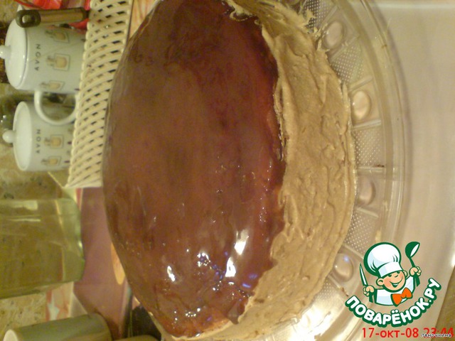 Варим глазурь. Остужаем немного. Заливаем торт глазурью (можно весь, или только верх). Бока смазать кремом, заранее оставленным