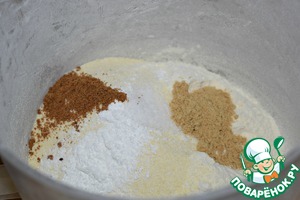 В миске смешать просеянную с разрыхлителем муку, манную крупу, соль, имбирь, мускатный орех.