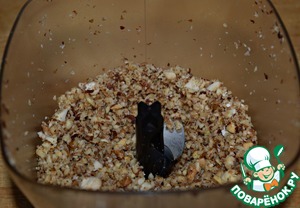 Орехи измельчить в блендере (или порубить ножом) так, чтобы получились и крупные кусочки, и мелкие.