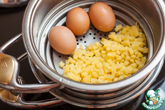 На кастрюлю ставим пароварку. В ней мы будем варить яйца без воды (обязательно хорошенько помойте их с мылом!) и картофель для винегрета, причем если вы не придерживаетесь поста (картофель пропитается куриным соком), то его можно приготовить и на нижнем ярусе - просто положите его отдельной кучкой.