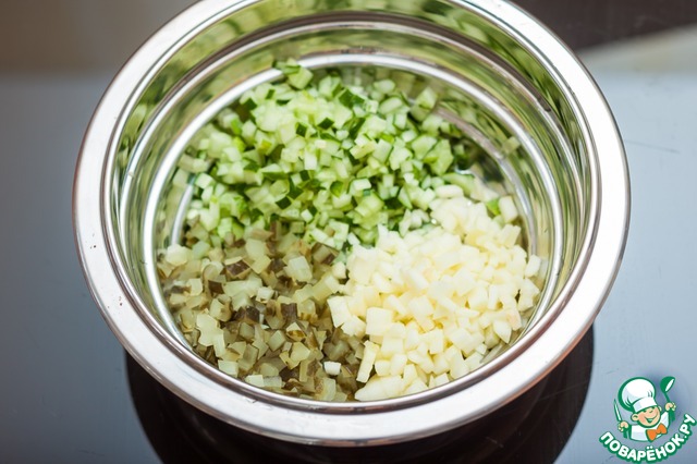 Тем временем готовим остальные ингредиенты для салата - мелко нарезаем свежие и соленые огурчики, очищенное от кожуры яблоко. Если любите лук, то и его тоже.
