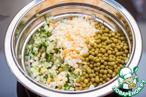 Мелко нарезаем яйца и добавляем вместе с горошком, яблоком и огурцами к остывшим овощам с курицей.