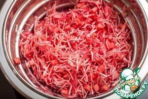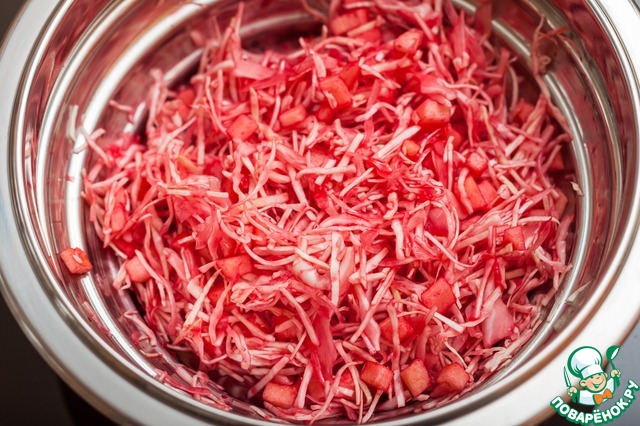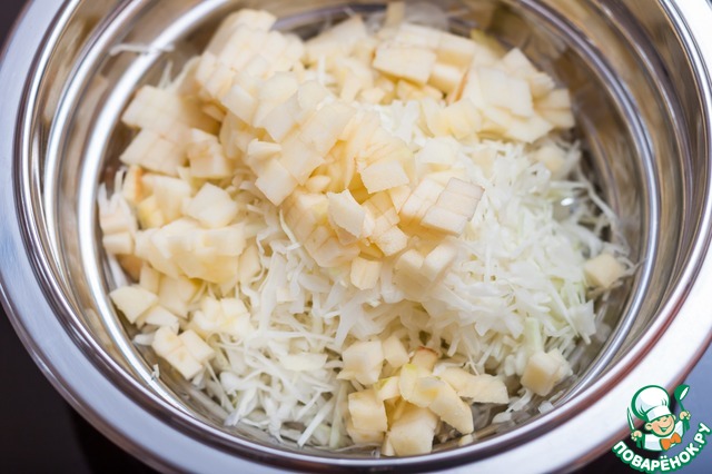 Шинкуем капусту, немного мнем ее руками, добавляем очищенное нарезанное кубиками или соломкой кисло-сладкое яблоко.