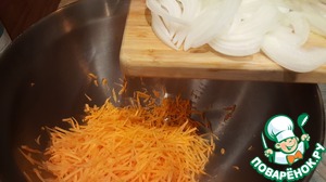 Разогреть на сковороде растительное масло, обжарить лук до золотистости, добавить морковь.